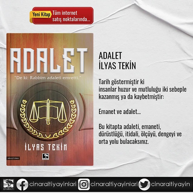 Emekli ilçe milli eğitim Müdürü İlyas teki'in yeni kitabı "ADALET" çıktı. tarih göstermiştirki insanlar huzur ve mutluluğu iki sebeple kazanmış ya da kaybetmiştir. Emanet ve adalet