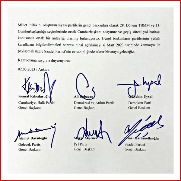 Toplantının ardından yapılan yazılı açıklamada, “Millet İttifakı'nı oluşturan siyasi partilerin genel başkanları olarak 28. Dönem TBMM ve 13. Cumhurbaşkanlığı seçimlerinde ortak cumhurbaşkanı adayımız ve geçiş süreci yol haritası konusunda ortak bir anlayışa ulaşmış bulunuyoruz. Genel başkanların partilerinin yetkili kurullarını bilgilendirmeleri sonrası nihai açıklamayı 6 Mart 2023 tarihinde kamuoyu ile paylaşmak üzere Saadet Partisi’nin ev sahipliğinde tekrar bir araya geleceğiz” ifadeleri kullanıldı.