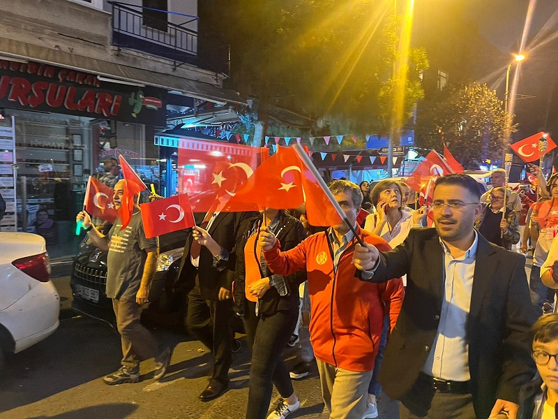Bando takımı marşları eşliğinde yürüyen kalabalığa fener alayı da eşlik etti.