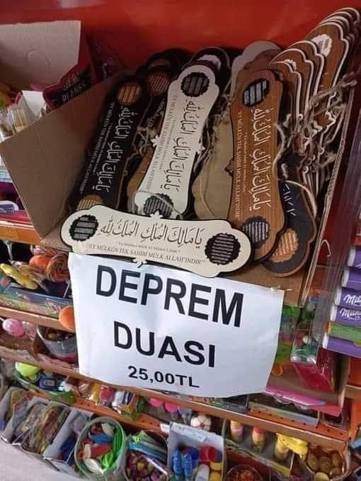 Dini kitap satan yerler, "Deprem duası" adı altında bir dua levhasını (magnet) müşterilerin beğenisine sunuyorlar. Altında mıknatıs bulunan levhayı; salonun bir köşesine, buzdolabına veya kapınıza asabilirsiniz.