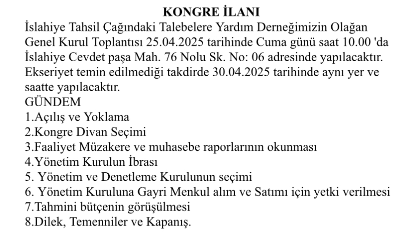 ISLAHİYE TAHSİL ÇAĞINDAKİ TALEBELERE YARDIM DERNEĞİ KONGRE İLANI16 Nisan 2025, Çarşamba - 20:26Etiketler: Etiket Eklenmemiş.