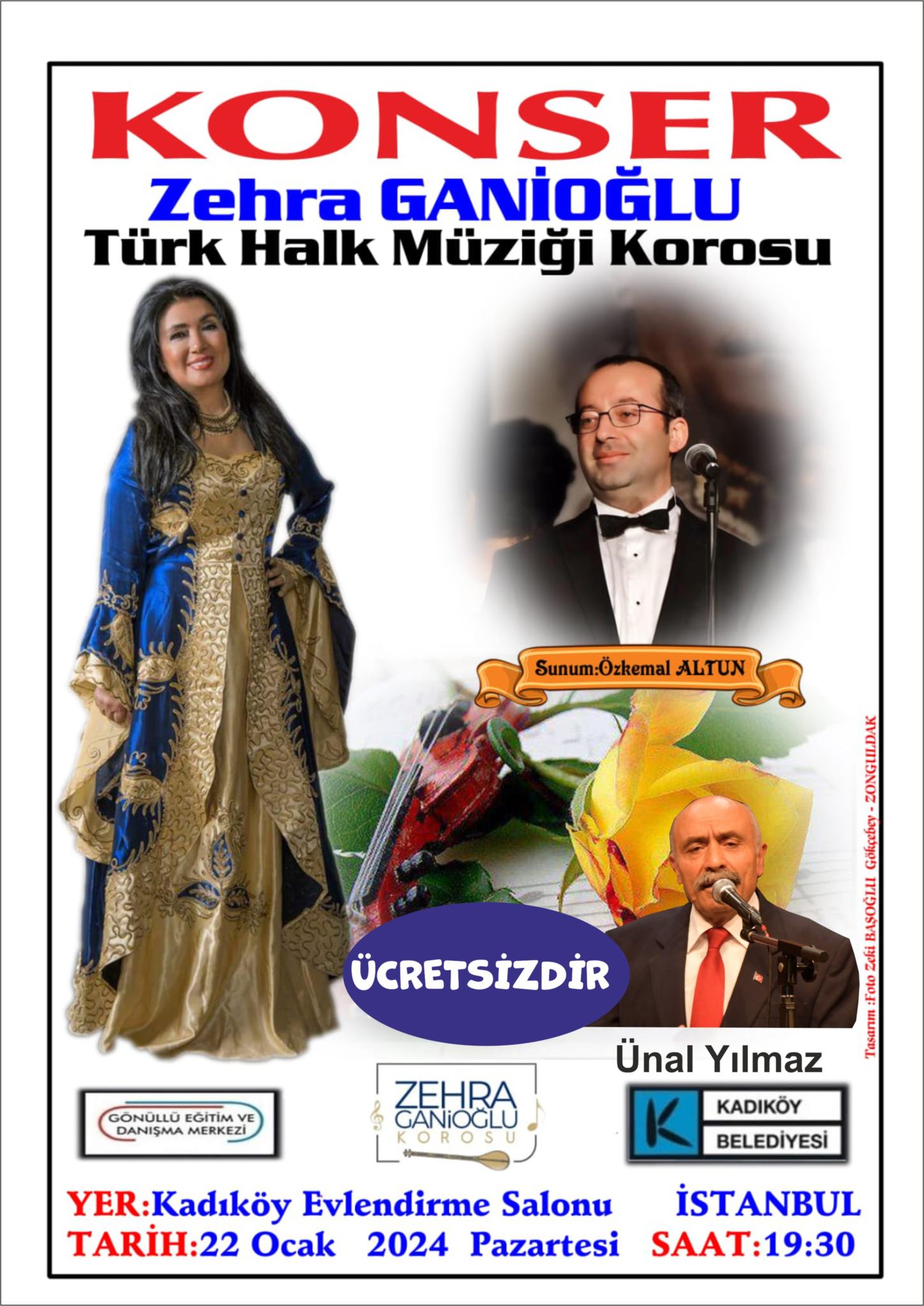 Kadıköy Belediyesi ve Gönüllü Eğitim ve Danışma Merkezince Kadıköy'de bir konser organize edildi. Konserde TRT Sanatçısı Zehra Ganioğlu şefliğinde Türk Halk Müziği Korosu sahne alacak.