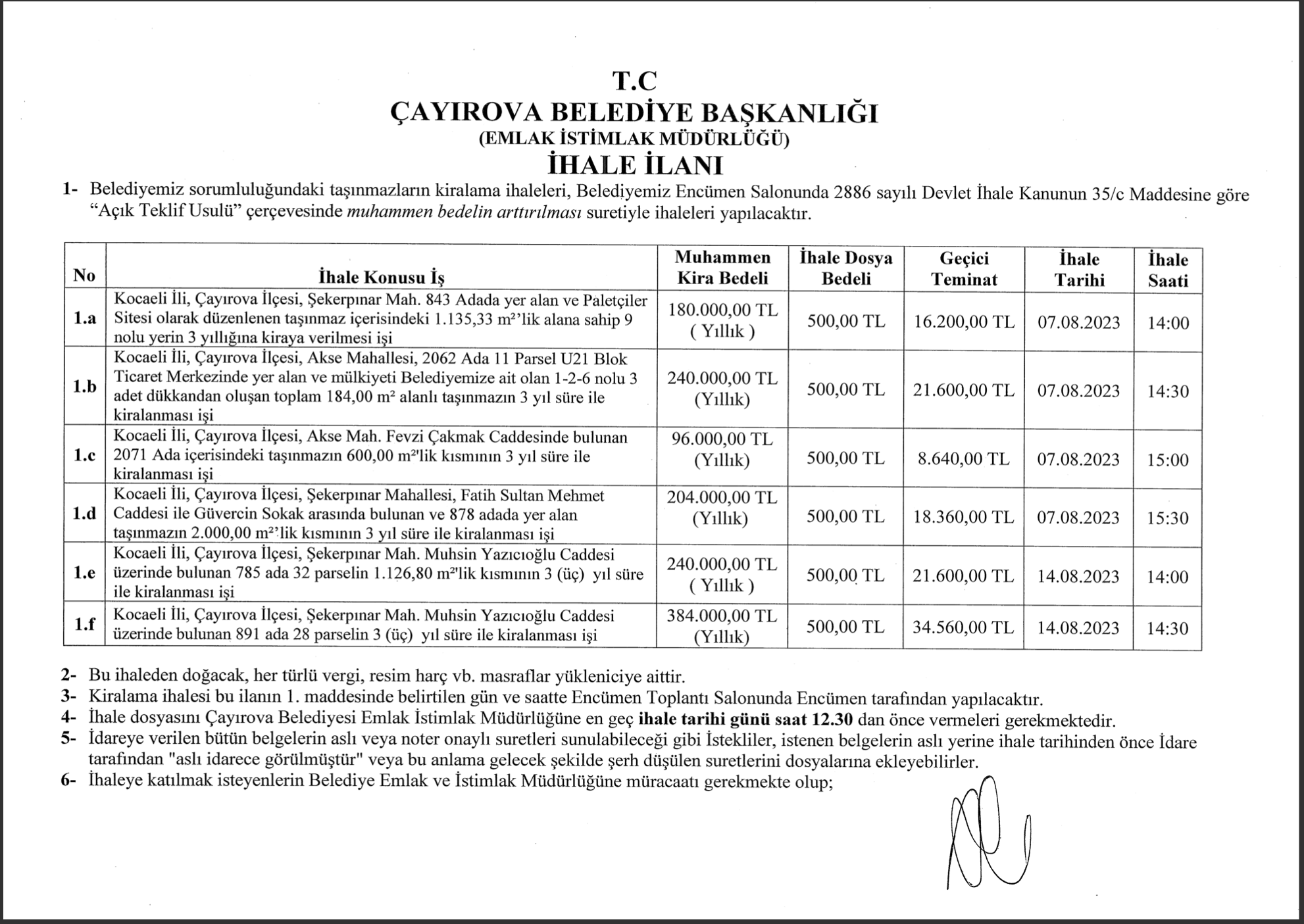 Yazımız ekindeki ilan metninde bilgileri bulunan taşınmazlar, 2886 sayılı D.İ.K.'nun 45.maddesine göre ''Açık Teklif Usulü'' ile ihale ilan metnindeki tarihlerde ihale edilecektir.