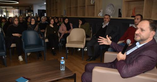 Dijital bağımlılıklar, psikolojik dayanıklılık üzerine çok sayıda çalışması bulunan Yazar Mehmet Dinç “Kütüphane Söyleşileri”nin konuğu oldu. Söyleşide gençlere kitap ve kitap okuma konusunda tavsiyelerde bulunan Dinç: “Kitap seçiminde dikkatli olun. Her kitabı okumak zorunda değilsiniz. Yanlış gıda bedene zarar verdiği gibi yanlış kitap da zihnimize zarar verebilir.” dedi.