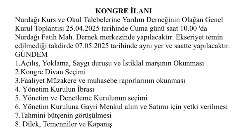 NURDAĞI KURS VE OKUL TALEBELERİNE YARDIM DERNEĞİ KONGRE İLANI16 Nisan 2025, Çarşamba - 20:33Etiketler: Etiket Eklenmemiş.