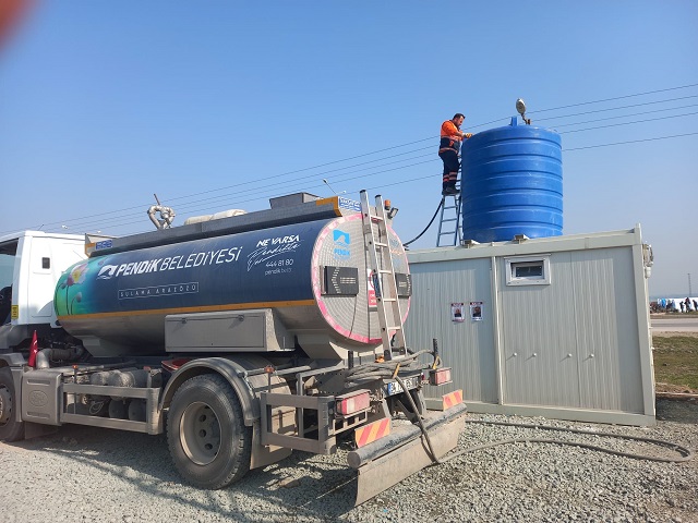 Pendik Belediyesi Hatay'da haftanın her günü temizlik yapıyor. Çadır kentin su ve temizliğinden soumlu olan Pendik Belediyesi çalışanları, çadır kent sokaklarını her gün süpürüyor, çop konteynerlerini ilaçlıyor, seyyar tuvaletlerin bakımını yapıyor ve kente temiz su getiriyor.