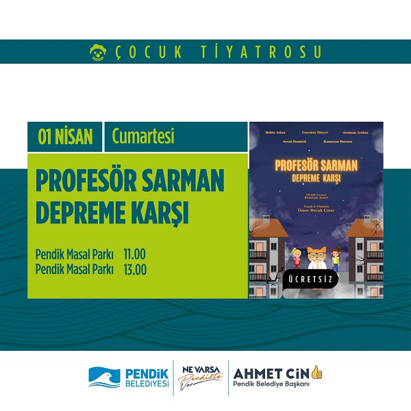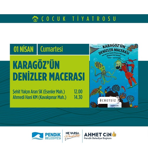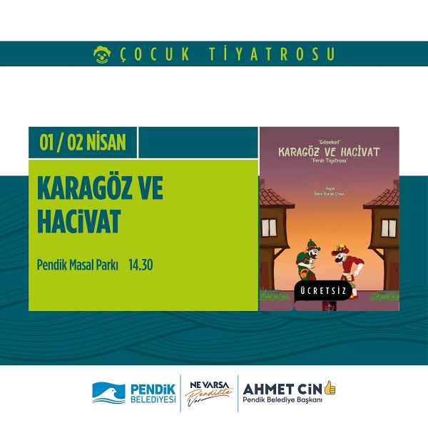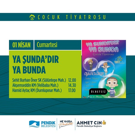 Pendik Belediyesinden 1 Nisan Cumartesi ve 2 Nisan Pazar günü saat 11.00 ve 13.00 ve 14.00 tiyatro gösteriler.
