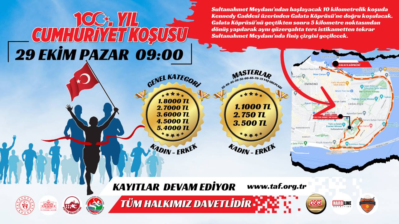 Türkiye Cumhuriyeti'nin 100. yılında, en büyük ve en anlamlı koşu Atletizm Federasyonu ve Fatih Belediyesi işbirliği ile Sultanahmet – Eminönü parkurunda gerçekleştirilecek.