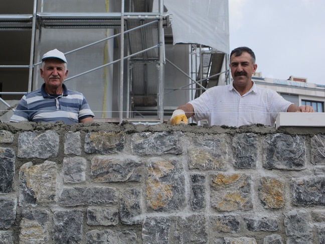 Özel taşı yerine uygun yontan Orhan-Ferit ve Adnan Önalan usta; önce harçı döküyor, sonra taşı koyup, sağdan sola ve yukardan aşağıya taşı teraziye alarak, sıkıştırmak için küçük dokunuş yapıyor. Bir iki tıkla taş yüz beş yüz yıl kacak yerine oturuyor.